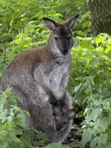 Skippy og Sussi er vores to dværgkænguruer. Og en lille unge er kommet frem fra dagens lys i oktober 2025. Racen hedder Rednecked wallabies.